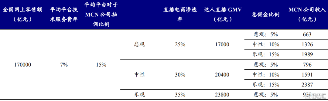 基於中性假設,虛擬人帶貨總傭金包的比例爲10%,那麼至2025年,中性預期下,我們預計虛擬人全年直播帶貨爲MCN公司帶來1591億元的收入。