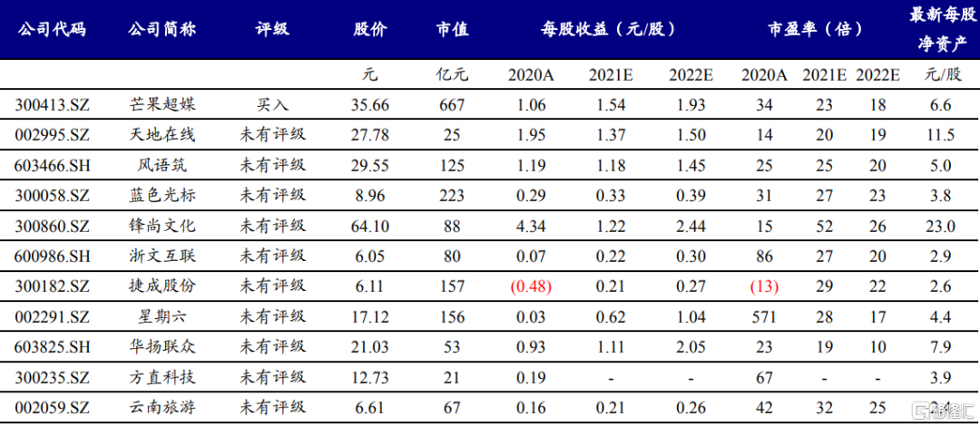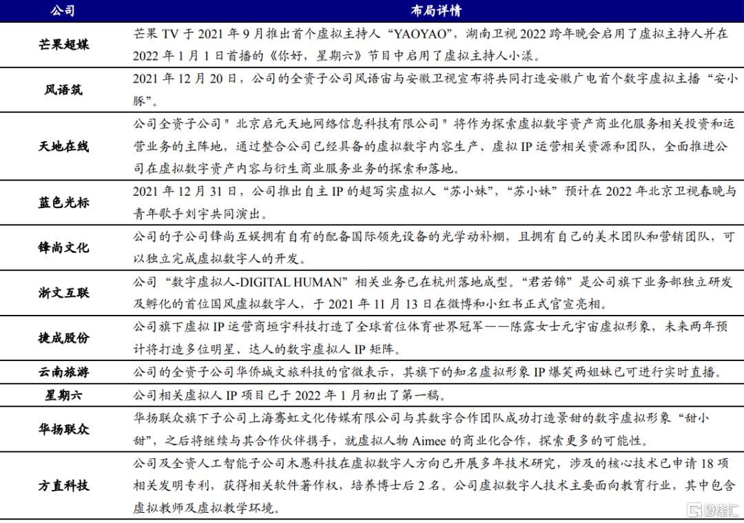 頭部營銷/影視上市公司具備較強的內容創作、流量運營等能力,或擁有更高概率打造出虛擬人頭部IP,併成功實現商業化。(1)芒果超媒:公司旗下的芒果TV深耕年輕女性用戶羣體,或與虛擬人的受衆更爲類似,對於目標羣體的研究更深入、營銷打法更擅長。同時,芒果TV擁有較強的內容創造和把控能力,持續推出《明星大偵探》、《乘風破浪的姐姐》等經典自制綜藝,或可複製至虛擬人打造。根據QuestMobile的數據,2021年下半年以來芒果TV的MAU已穩定超過2億,且在2021年6-9月的暑期檔超越優酷,成爲第三大在線視頻平臺;芒果超媒的自有平臺流量或將助力虛擬人IP的孵化和傳播。(2)風語築:公司是數字化體驗服務商,曾打造迪拜世博會中國館、廣州TeamLab沉浸式新媒體大展等,積累了豐富的數字內容創意資源、技術人才和落地場景,相關經驗或能應用至虛擬人業務。子公司風語宙已配備虛擬人開發團隊,與安徽衛視合作打造虛擬人“安小豚”,商業化落地值得期待。(3)天地在線:公司依託豐富的廣告主服務經驗,且擁有專業的廣告內容創意、策劃團隊,或可賦能其虛擬人制作和運營。此外,公司在通州紫光科技園21號樓配備20多間數字化影棚(環形數字化影棚、數字虛擬攝影棚和激光數字影棚等),或爲虛擬人業務提供強大的基礎技術支撐。(4)藍色光標:公司構建了營銷服務全產業鏈,並推出虛擬直播間及自有IP虛擬人“蘇小妹”,虛擬人的商業化或快速落地。其他佈局虛擬人的公司包括鋒尚文化、浙文互聯、捷成股份、雲南旅遊、星期六、華揚聯衆、方直科技等。