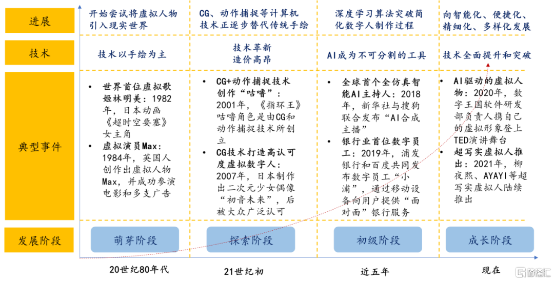 虛擬人已發展至以“AI驅動、超寫實展現”爲特徵的成長期。虛擬人自20世紀80年代開始發展,當時技術以手繪爲主;隨後,傳統手繪逐漸被CG、動作捕捉等技術取代,且深度學習算法得到突破,虛擬人的製作過程得以簡化,並朝着智能化、便捷化、精細化、多樣化的方向演進。如今,虛擬人產業已邁入成長階段,技術或不再是行業重要壁壘,應用場景逐漸拓寬,廠商蜂擁而至,黃金時代或將來臨。