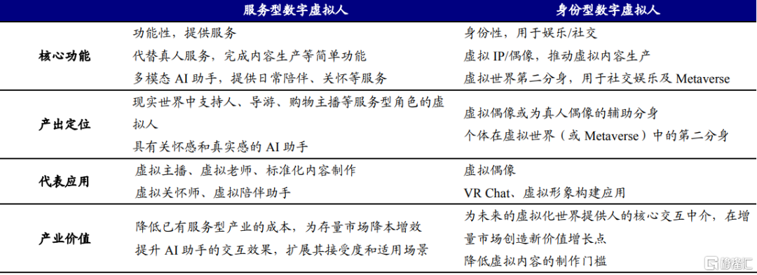 虛擬人可分成服務型和身份型。服務型虛擬人主要用於代替真人服務,是現實世界中服務型角色的虛擬代表。身份型虛擬人多爲虛擬IP/偶像,意在推動虛擬內容的生產,亦可是虛擬世界裏用戶的第二分身。
