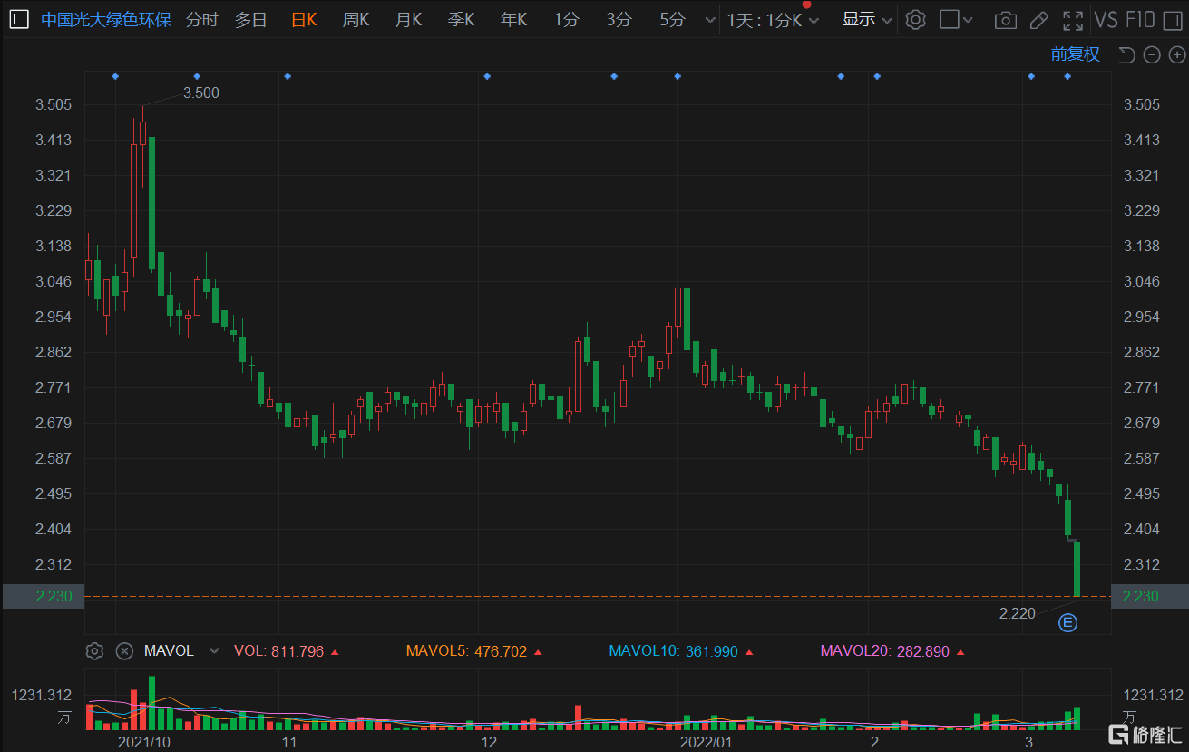 格隆匯3月9日丨中國光大綠色環保(1257.HK)續跌近7%,6日連跌15%。報2.22港元創歷史低價,總市值46億港元。公司2021年營業收入84.47億港元,同比下降14.12%,歸屬母公司淨利潤11.10億港元,同比下降26.10%。交銀指出,資本支出在20財年達峯帶來的建造收入減少,是21財年利潤下降的主要原因。