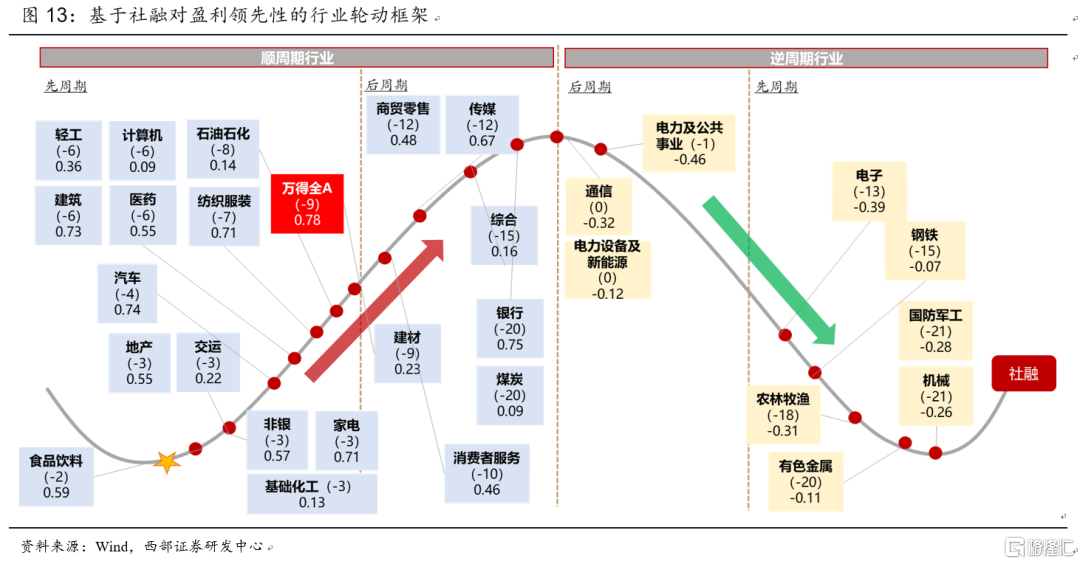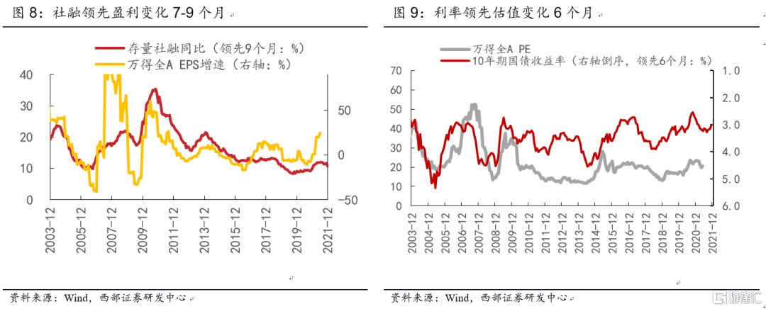 社融(量):流動性通過信用-盈利週期實現從央行、金融機構向實體企業的傳導,社融增速往往領先盈利增速拐點2-3個季度。