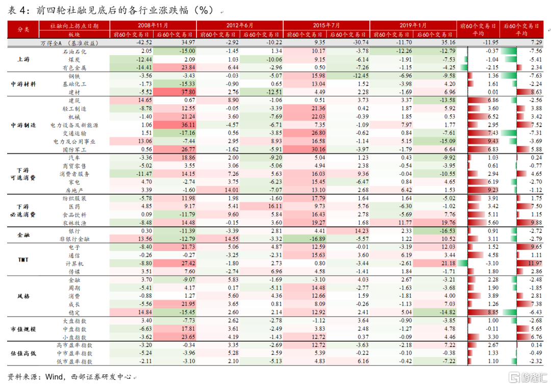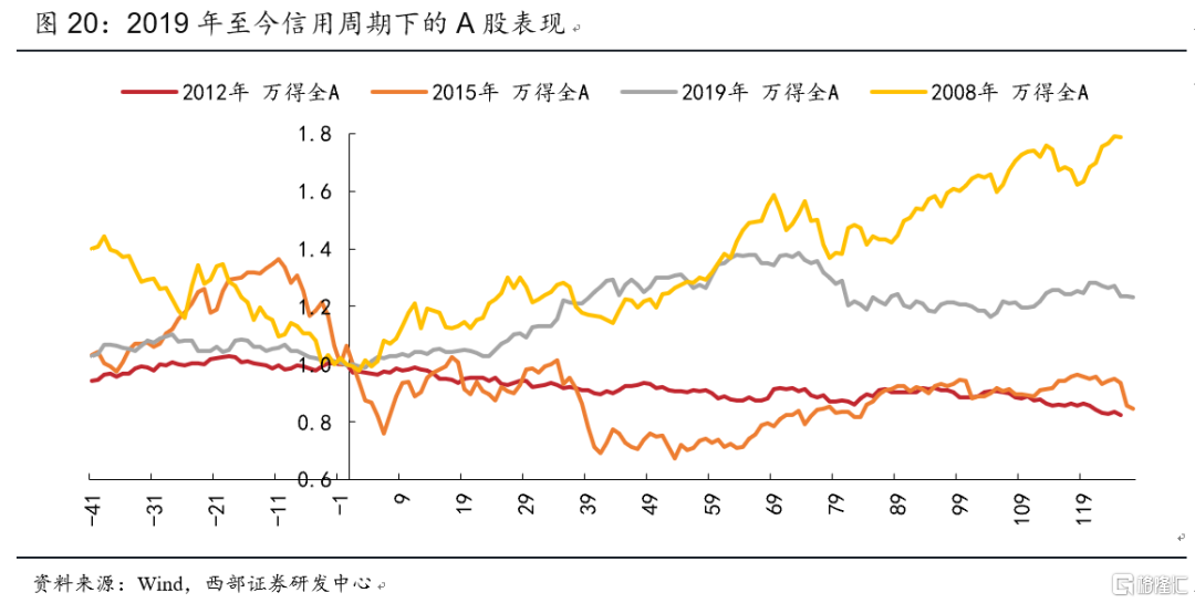 從歷史經驗來看,歷次社融見底後市場表現分化。從信用週期研究框架的角度來看,股市在類衰退階段多數爲熊市,而隨着時鐘從類衰退階段切換至類復甦階段,股票的配置價值也會開始提升。不過就市場表現而言,社融反彈前後市場整體走勢並無趨勢性規律,研究結果也反映出類復甦階段股票更多呈現出牛熊概率對半的格局。2008年以來,社融經歷過四輪見底回升,分別發生於2008年11月、2012年6月、2015年7月和2019年1月。整體來看,社融拐點均發生於經濟下行壓力較大的階段,在社融觸底反彈後3-5個月,經濟開始築底回升。2012年6月市場對當時僅公佈的社融增量數據反映相對平淡,經濟衰退與歐債危機背景下,社融回升後萬得全A指數反而仍持續走低;2015年7月市場在股災的恐慌情緒下震盪走低;2008年11月以及2019年1月市場情緒與估值均處於谷底之中,大幅超額預期的社融數據推動了市場的快速上行。整體來看,除了2015年股災,社融拐點出現後市場整體上行空間大於下行空間,寬信用對市場的影響是偏積極的。