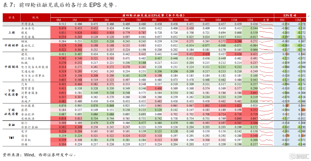從企業盈利的維度來看,在信用週期回落階段,逆週期、中下遊板塊景氣度提升。2008年以來,社融同比增速共出現過4次觸頂回落,分別發生在2008年2月、2010年1月、2013年4月和2017年7月。從這4次社融見頂後6個月各行業EPS的走勢來看,中下遊部分行業盈利能力出現改善,其中中遊材料、軍工、可選消費、通信等板塊景氣度提升較爲顯著。