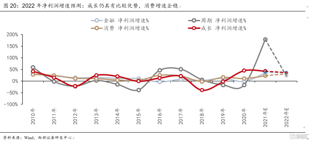 2022年上半年看好成長,下半年消費有望接棒。從社融增速與各行業EPS增速相關性與領先性關係來看,信用週期上行期的投資機會從後周期/逆週期板塊逐步切換至順週期板塊,消費、金融行業的配置價值將逐漸顯現。對於2022年行業配置,我們的盈利預測顯示2022年成長淨利潤增速仍具有比較優勢,消費業績底部回升。上半年經濟下行壓力較大,貨幣流動性寬鬆支撐成長行情,同時業績增長能夠消化一部分估值,結構上新能源車鋰電、風電/光伏/氫能、半導體等高景氣賽道仍有較不錯的配置價值。下半年隨着PPI向CPI傳導,CPI逐級擡升,消費有望接力成長;行業上可以關注①直接受益於漲價的農業,②必需消費,包括具備成本傳導邏輯的食品飲料;③缺芯緩解背景下的汽車。
