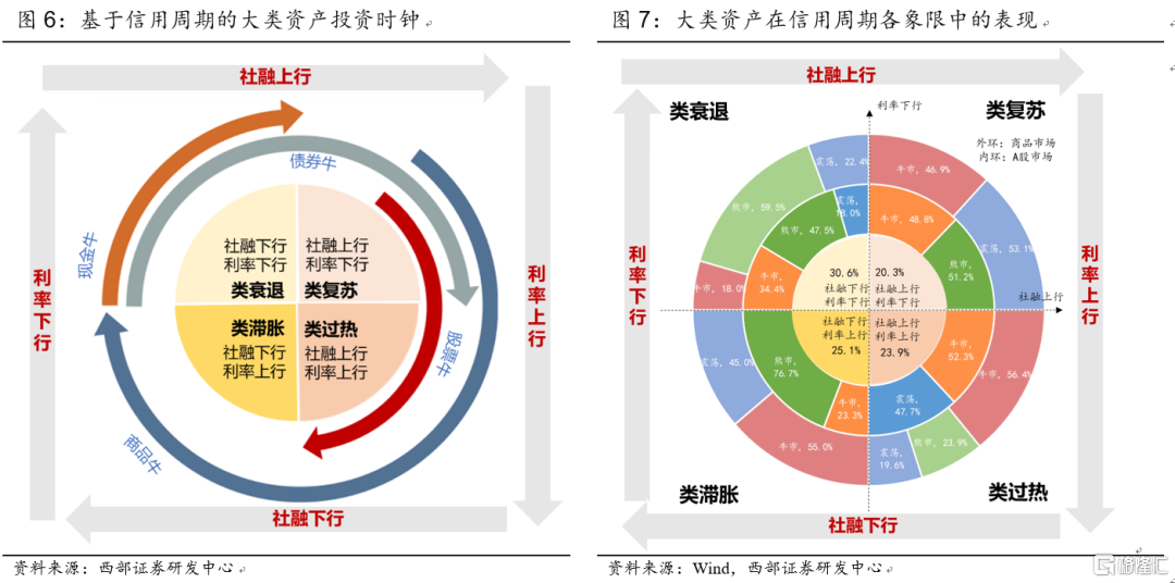 第一階段:類復甦(社融上行,利率下行):企業信貸需求開始上升,利率仍在下行通道,這個時候股票和商品的配置價值開始顯現,股市多處於蓄力階段,A股出現牛市的概率爲48.8%,出現熊市的概率爲51.2%。商品出現牛市的概率爲46.9%,出現震盪市的概率爲53.1%。