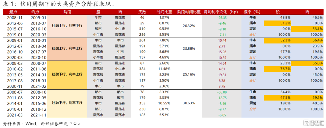 爲了區分信用週期的不同階段,我們以調整口徑後的社融同比增速與10年期國債利率爲劃分依據,將2008年3月起至2021年11月末的時間區間劃分成四個象限:1)類復甦:社融上行,利率下行→2)類過熱:社融上行,利率上行→3)類滯脹:社融下行,利率上行→3)類衰退:社融下行,利率下行。類復甦階段平均歷時170個交易日,類過熱階段平均歷時200個交易日,類滯脹階段平均歷時168個交易日,類衰退階段平均歷時205個交易日。這四個階段的時間比重分別爲20.3%、23.9%、25.1%與30.6%。