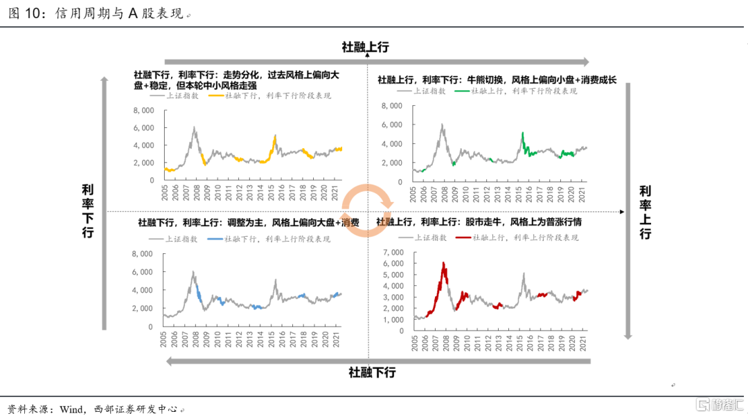 從2008年起,不同信用週期階段中大類資產與風格表現呈現出不同特徵:1)類復甦:社融上行,利率下行往往對應經濟觸底復甦,政策轉寬,股商機會開始顯現,中小盤+成長消費相對更好;2)類過熱:社融上行,利率上行期間,股商雙牛,A股行業普遍上漲;3)類滯脹:社融下行,利率上行期間,基本面繼續回暖,刺激政策退出,往往出現股熊商牛的格局,A股風格切換至大盤,消費相對抗跌;4)類衰退:社融下行,利率下行期間,往往出現股商雙熊,A股僅穩定風格相對收益較好。