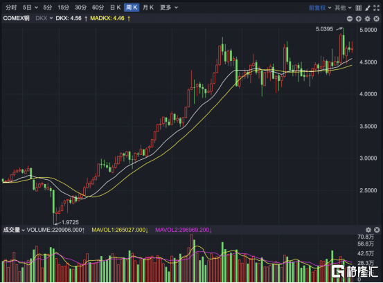 近期,銅在全球三大交易所的低庫存特徵,再度引起了關注——在歷史低位區間的背景下展現出下降的趨勢。加之受到經濟刺激與復甦的預期帶動,在高位伺機盤旋的銅價,正蠢蠢欲動,有意逐步挑戰新高。
