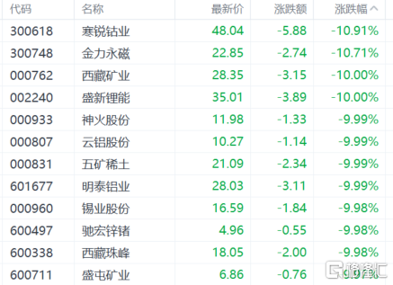 資源股全線大跌,有色金屬跌幅居前。西藏礦業、盛新鋰能、神火股份、雲鋁股份等跌停。信達證券認爲,在穩增長政策疊加高通脹預期背景下,金屬資源板塊將繼續受益,金屬價格高位運行和企業業績大幅增長將持續推動資源龍頭企業估值修復。