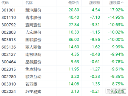 互聯網電商概念股持續走低。凱淳股份跌超17%,青木股份跌超14%,壹網壹創、吉宏股份、吉宏股份跌停,焦點科技、麗人麗妝、聯絡互動、南極電商等跟跌。