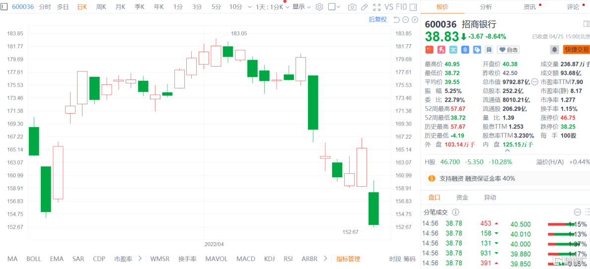 個股方面,招商銀行跌8.64%報38.83元,總市值9792億元。消息面上,招行常務副行長王良迴應股價大跌表示:非常着急,已與投資者深入溝通。此前招商銀行原黨委書記、行長田惠宇涉嫌嚴重違紀違法,目前正接受中央紀委國家監委紀律審查和監察調查。另外,招商銀行公佈財報顯示,2022年一季度淨利潤360.22億元,同比增12.52%。