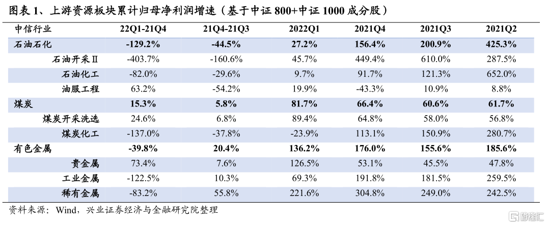 石油石化2022Q1淨利潤增速爲27.2%(基於中證800+中證1000成分股,同比數據,以下皆同),較2021Q4回落129.2個百分點;2021Q4淨利潤增速爲156.4%,較2021Q3的200.9%回落44.5個百分點。從細分板塊來看,景氣有所分化:一季度整體來看受OPEC增產不及預期及“俄烏衝突”等供給方面的影響,帶動國際油價大幅衝高,一方面上遊石油開採優先從中受益,淨利潤維持了40%以上的增速,但較2021Q4邊際大幅回落;另一方面,受疫情影響整體需求走弱,裂解價差收窄,導致石油化工板塊淨利潤增速承壓;最後,油服工程受益於上遊資本開支的增加,淨利潤增速較2021Q4明顯提升,景氣趨勢向好。往後看,後續油價仍將維持在較高中樞,一方面供給端的擾動仍在,如最近的歐盟計劃對俄羅斯原油和成品油實施進口禁令,以及利比亞油田停產等衝擊;然而對全球經濟增長的悲觀預期、美聯儲快速的加息節奏等也將對油價帶來壓制;整體來看二季度原油價格大概率高位震盪,石油開採和石油化工板塊淨利潤增速彈性有限,後續可以重點關注油服方向。