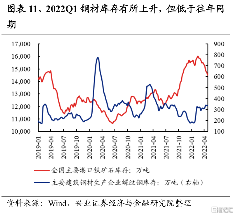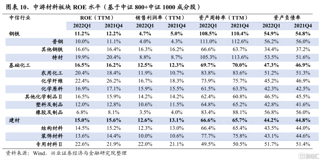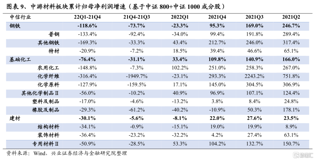 鋼鐵2022Q1淨利潤增速爲-23.3%,較2021Q4回落118.6個百分點;2021Q4淨利潤增速爲95.3%,較2021Q3的169.0%回落73.6個百分點。儘管在2022年一季度鋼材價格有所反彈,但一方面成本端鐵礦石及焦炭價格高企,另外在疫情擾動、春季開工受阻、物流不暢等因素影響下,鋼鐵需求也走弱,導致一季度淨利潤增速大幅下滑。往後看,一方面4月份發改委提出將繼續壓減全國粗鋼產量,鋼鐵生產供給端仍然受到壓制;但另一方面,若後續疫情改善,“穩增長”政策持續發力下,鋼鐵需求或將釋放,二季度鋼鐵板塊淨利潤增速或小幅回暖。