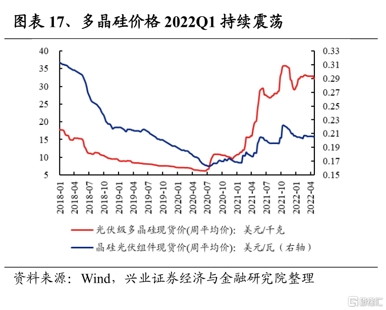 電力設備及新能源2022Q1淨利潤增速爲40.1%,較2021Q4回落6.6個百分點;2021Q4淨利潤增速爲46.7%,較2021Q3的35.7%回升11.1個百分點。從細分板塊來看,2022年一季度,電氣設備和新能源動力系統增速邊際回落;僅電源設備增速達到60%,同時較21年全年增速繼續上行,主要是受益於國內外光伏裝機量同比高增,2022Q1淡季不淡;而風電行業的“搶裝”潮已步入尾聲,下遊裝機需求有所回落。往後看,光伏方面,硅料環節有望延續緊平衡,進而使價格盈利維持高位,而國內外光伏裝機需求同比高增趨勢有望延續,持續支撐光伏板塊高景氣度。風電方面,隨着補貼退坡,風電“搶裝潮”結束,裝機需求的回落將使淨利潤增速承壓。新能源車方面,由於汽車產業鏈較長,復工復產所需時間長,疫情在二季度將對汽車產業鏈的產銷兩端繼續造成擾動,而上遊鋰電池成本高企、下遊提價潮對需求的壓制等因素,也將使新能源車淨利潤增速在二季度繼續承壓。
