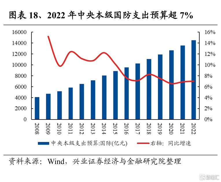 國防軍工2022Q1淨利潤增速爲18.6%,較2021Q4回升12.4個百分點;2021Q4淨利潤增速爲6.2%,較2021Q3的17.0%回落10.9個百分點。軍工板塊的生產經營受疫情擾動影響較小,且對經濟波動的敏感性也相對較低,2022Q1淨利潤增速呈現韌性。往後看,2022年中國軍費預算增長7.1%,高於GDP目標增速;裝備採購需求落地確定性強,對經濟波動敏感性低;另外“俄烏衝突”下國際形勢趨緊,進一步提升國防和軍隊建設剛性;疊加軍工行業配套體系相對封閉,管控有力,受疫情擾動較小,淨利潤增長確定性強;最後從戰略視角來看,在百年不遇之大變局下,國防安全重要性凸顯,“十四五”規劃還強調要“加快國防和軍隊現代化,實現富國和強軍相統一”,和其他行業相比,當下軍工行業的成長確定性尤爲突出。
