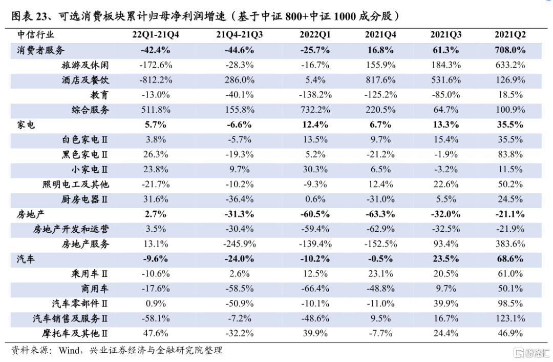 汽車2022Q1淨利潤增速爲-10.2%,較2021Q4回落9.6個百分點;2021Q4淨利潤增速爲-0.5%,較2021Q3的23.5%回落24.0個百分點。上海、長春等地的汽車產業鏈受到疫情衝擊,供給端整車廠、零部件廠家等停產停工;需求端終端零售走弱,使汽車板塊景氣回落。往後看,受經濟下行壓力及疫情擾動影響,汽車淨利潤增速在2022年二季度或將繼續承壓。而汽車產業鏈較爲精密複雜,導致從復工復產啓動到整體產業鏈生產的恢復,期間存在較長的時滯。在疫情衝擊過後,行業至少要到二季度末或三季度初,纔有望出現產銷回補,進而推動景氣拐點到來。