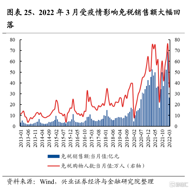 消費者服務2022Q1淨利潤增速爲-25.7%,較2021Q4回落42.4個百分點;2021Q4淨利潤增速爲16.8%,較2021Q3的61.3%回落44.6個百分點。2022年一季度,受奧密克戎毒株的影響,疫情多點散發,旅遊、酒店、餐飲、免稅等行業受到較大沖擊。往後看,二季度消費者服務淨利潤增速仍將承壓:2022年清明節假期3天,全國國內旅遊出遊7541.9萬人次,同比減少26.2%,按可比口徑恢復至2019年同期的68.0%;實現國內旅遊收入187.8億元,同比減少30.9%,恢復至2019年同期的39.2%;2022年“五一”假期5天,全國國內旅遊出遊1.6億人次,同比減少30.2%,按可比口徑恢復至疫情前同期的66.8%;實現國內旅遊收入646.8億元,同比減少42.9%,恢復至疫情前同期的44.0%;二季度兩個重要節假日的出行消費數據並不理想;免稅銷售方面,2022年一季度海南離島免稅購物金額147.2億元,其中1-2月免稅購物金額爲120.7億元(單月平均達到60億元左右,創下新高),3月份僅26.5億元,4月部分三亞免稅店甚至臨時暫停營業,預計銷售額下滑明顯。預計疫情防控仍需時間,如果能在6月得到控制,屆時暑期相關的出行消費有望回暖,三季度消費者服務淨利潤增速將迎來困境反轉。