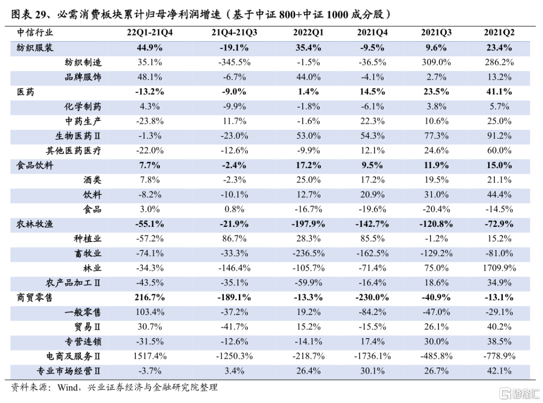 商貿零售2022Q1淨利潤增速爲-13.3%,較2021Q4回升216.7個百分點;2021Q4淨利潤增速爲-230.0%,較2021Q3的-120.8%回落189.1個百分點。從細分板塊來看,一般零售、貿易淨利潤增速轉正,而電商及服務淨利潤增速依舊大幅下滑,主要是疫情擾動消費需求走弱的同時,物流不暢,對板塊淨利潤增速形成拖累。往後看,預計疫情防控和物流運輸的恢復均需要時間,二季度板塊整體淨利潤增速仍將承壓,若三季度上述情況得到緩解則有望帶動淨利潤增速回暖。