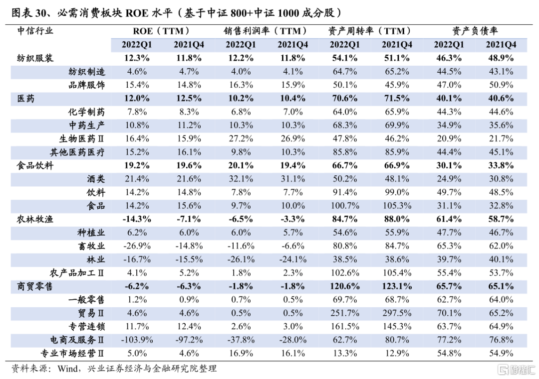 食品飲料2022Q1淨利潤增速爲17.2%,較2021Q4回升7.7個百分點;2021Q4淨利潤增速爲9.5%,較2021Q3的23.5%回落2.4個百分點。板塊內部出現分化,白酒實現“開門紅”,春節動銷旺季帶動板塊淨利潤增長提速;乳製品(飲料)則受益於毛利率改善,淨利潤亦呈現高增態勢。然而,受疫情擾動影響,餐飲等消費場景受損,物流運輸不暢,導致大衆品(啤酒、飲料、調味品(食品)等)放量受限,上遊糧食、大豆、白糖等原料價格上漲,進一步使大衆品盈利承壓。往後看,由於餐飲屬於聚集性消費場景,二季度疫情擾動下,食品板塊淨利潤增速或將繼續承壓,三季度有所修復;酒類(白酒、啤酒)方面,二季度淨利潤增速同樣承壓,或在三季度迎來改善,白酒中的次高端/大衆酒有望展現較強的淨利潤增速彈性,而啤酒將受益於疫情改善下的恢復性增長及7-8月的消費旺季,此外房地產政策的放鬆也有望催動白酒板塊景氣上行。