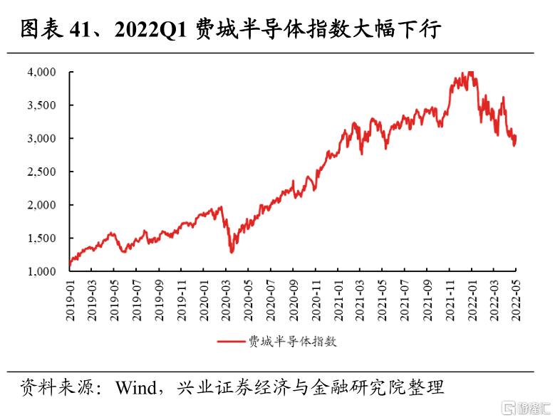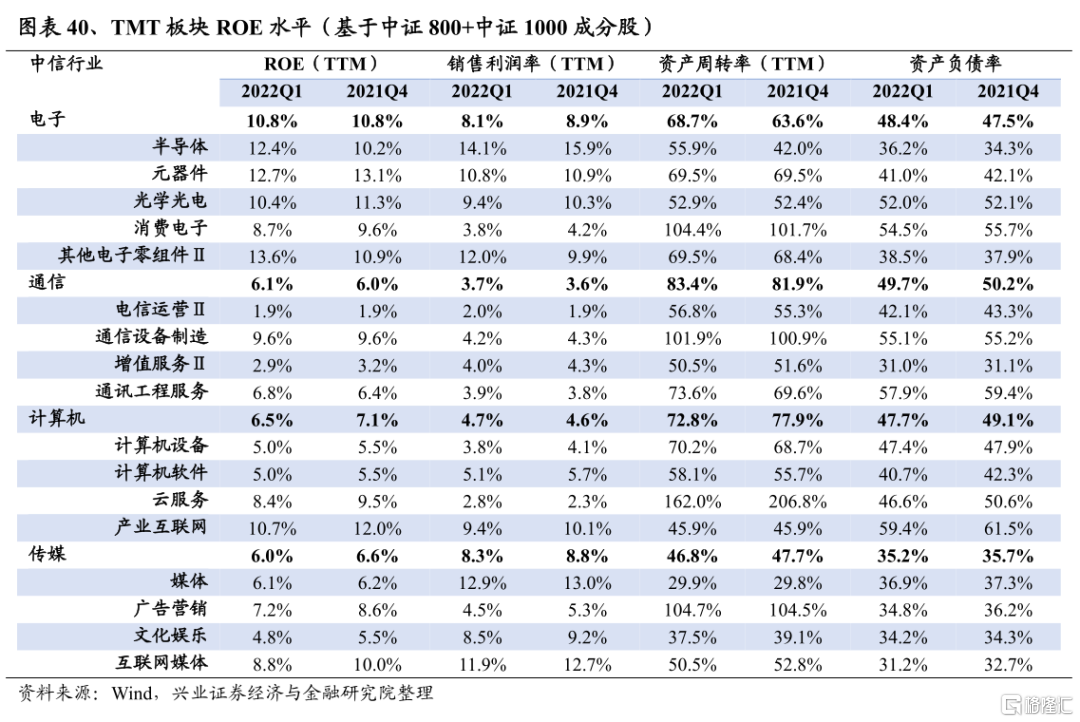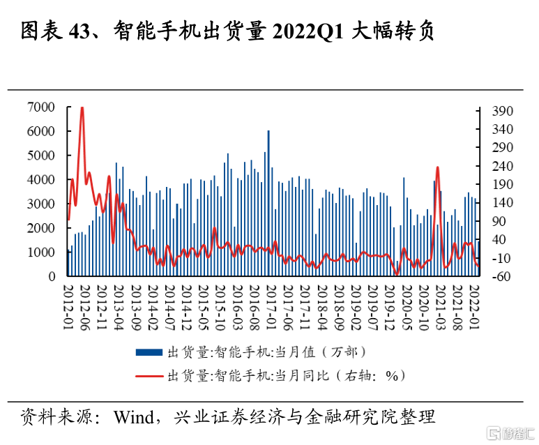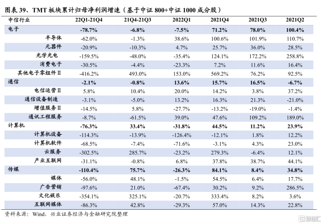電子2022Q1淨利潤增速爲-7.5%,較2021Q4回落78.7個百分點;2021Q4淨利潤增速爲71.2%,較2021Q3的78.0%回落6.8個百分點。半導體方面,受疫情擾動,在供給端,上遊供應商及半導體廠商自身在疫情衝擊下停工停產,影響訂單交付驗收進度;在需求端,汽車、計算機、機械等行業開工受阻,對芯片的下遊需求趨弱,供需雙弱疊加上遊原材料、運費漲價,致使板塊淨利潤增速大幅下滑。消費電子方面,據Canalys統計,2022Q1全球智能手機出貨量同比下滑11%,下遊需求的趨弱使板塊淨利潤承壓。往後看,半導體方面,二季度疫情對供應鏈的衝擊或仍將持續,而汽車、消費電子、5G等下遊需求也在持續回落,二季度淨利潤增速將繼續承壓,下半年疊加高基數影響,淨利潤增速或將繼續回落。消費電子方面,智能手機市場日益趨於飽和,且疫情及經濟下行壓力仍然壓制需求,消費電子板塊景氣或仍將下滑。