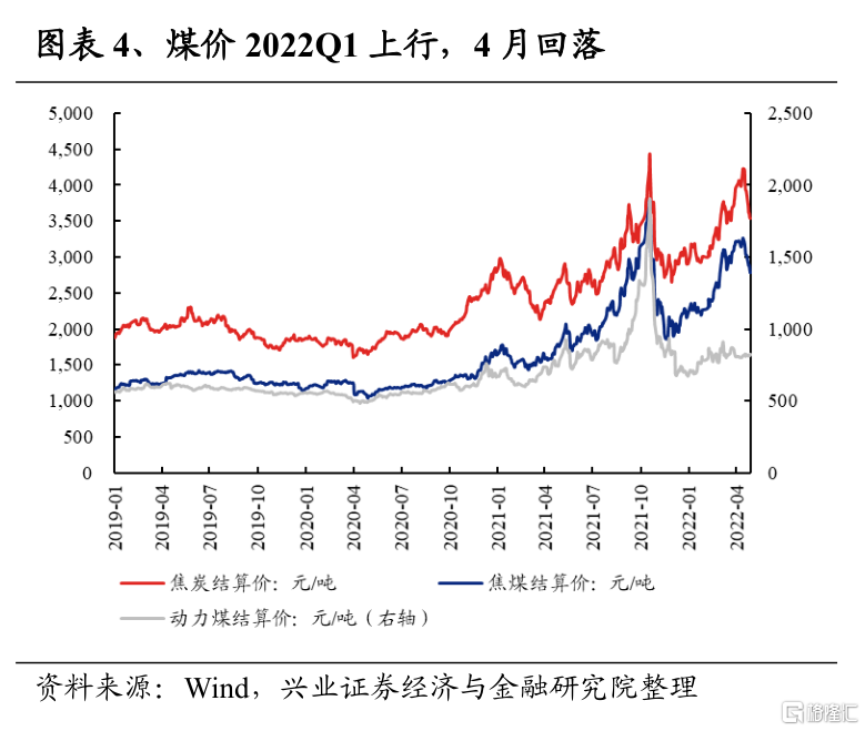 煤炭2022Q1淨利潤增速爲81.8%,較2021Q4回升15.4個百分點;2021Q4淨利潤增速爲66.4%,較2021Q3的60.6%上升5.8個百分點,連續兩期回升。2022年一季度,在國內“保供增產”的政策下,煤炭產量雖有提升,但進口煤價倒掛、進口量回落、線路檢修、安全事故等的擾動,使得供需仍然偏緊,煤價大幅走高並支撐板塊盈利高增。往後看,動力煤方面,4月受各地疫情影響發電需求疲軟,下遊庫存有所累積,短期價格承壓,後續隨着疫情改善逐步復工復產,用電需求改善或帶動價格繼續上漲;焦煤方面,供給彈性較小,後續在穩增長政策加碼的影響下,價格易漲難跌;整體來看煤炭行業二季度有望繼續維持高景氣,但下半年隨着基數原因的影響,雖然價格中樞維持高位但淨利潤增速大概率快速下行。