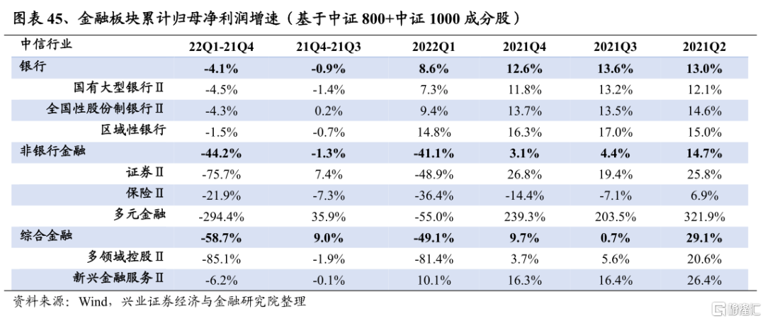 非銀行金融2022Q1淨利潤增速爲-41.1%,較2021Q4回落44.2個百分點;2021Q4淨利潤增速爲3.1%,較2021Q3的4.4%回落1.3個百分點。從細分板塊來看,證券和保險淨利潤增速均有較大回落:證券受市場大幅調整的影響,投資及代銷等業務景氣不振;保險負債端的新單業務和和資產端的投資業務均持續承壓。往後看,證券方面,4月市場繼續調整,後續市場有望築底震盪,整體來看二季度淨利潤增速仍將承壓;保險方面,雖然在地產風險緩釋、穩增長政策持續發力影響下,資產端有望企穩,但負債端短期仍受到人力清虛及疫情的擾動,淨利潤增速仍在築底中。
