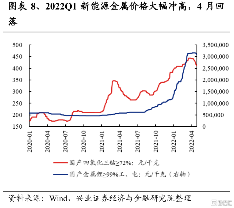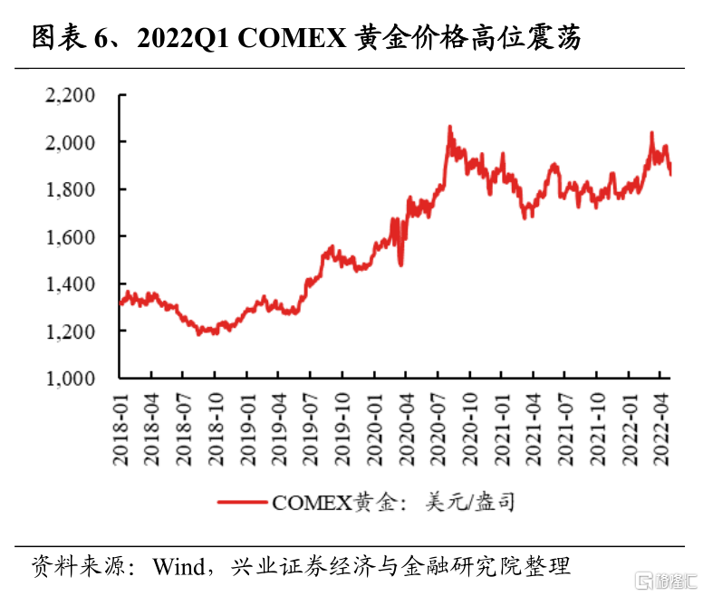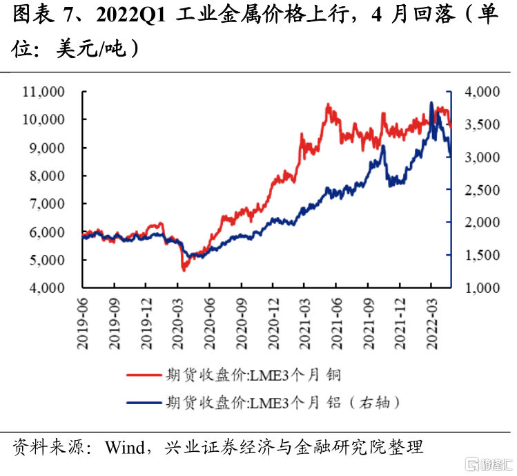 有色金屬2022Q1淨利潤增速爲136.2%,較2021Q4回落39.8個百分點;2021Q4淨利潤增速爲176.0%,較2021Q3的155.6%上升20.4個百分點。2022年一季度,“俄烏衝突”爆發之後,各類金屬價格伴隨油價一起大漲,並帶動各細分板塊盈利高增。往後看,二季度隨着美聯儲的預期加息及縮表次數更爲密集,美國10年期國債利率已經突破3%,並對金屬價格形成壓制,且美債期限利差的倒掛也預示着後續美國經濟的衰退,4月以來,銅、鋁、黃金、鋰等價格均有所回落。工業金屬以及稀有金屬方面,同時還受到國內疫情的衝擊,相關品種的國內需求也在走弱,整體來看,即使考慮到後續疫情有所修復,二季度工業金屬及稀有金屬的價格中樞或下臺階;建議關注黃金後續的配置價值,一方面海外通脹大幅回落之前黃金具有一定的抗通脹屬性,另一方面在美國經濟下半年存在“衰退”風險以及“俄烏衝突”仍存在不確定性的情況下,黃金的避險屬性也逐步凸顯。