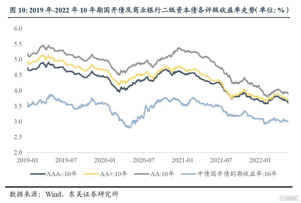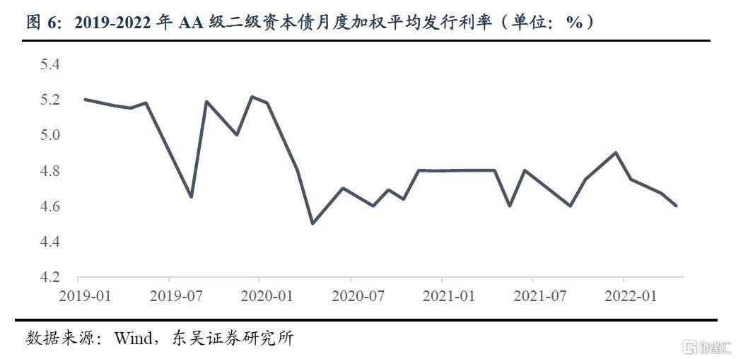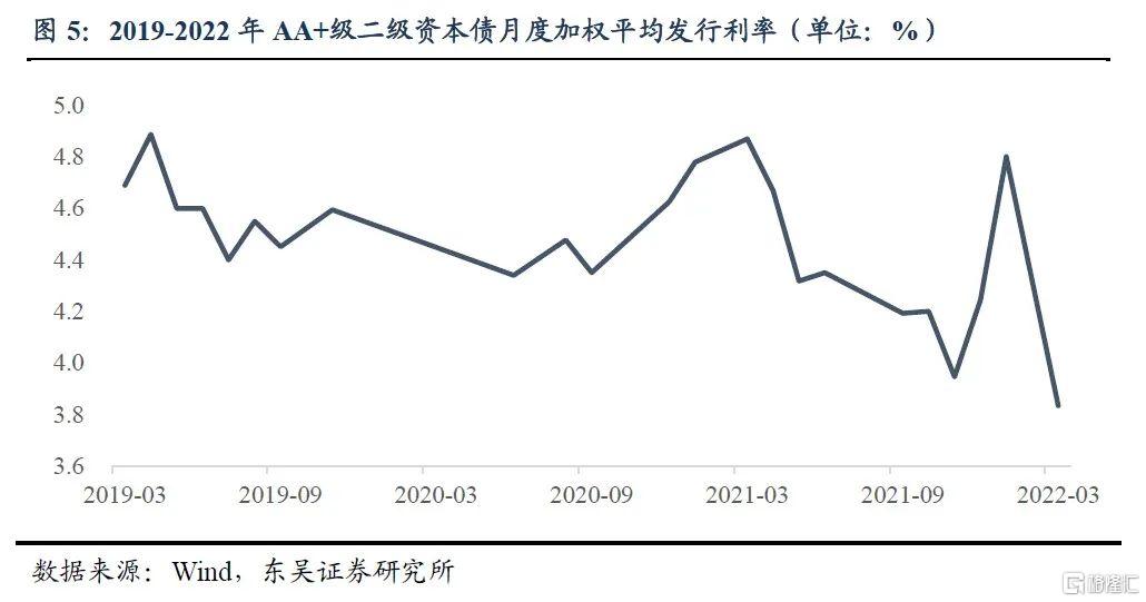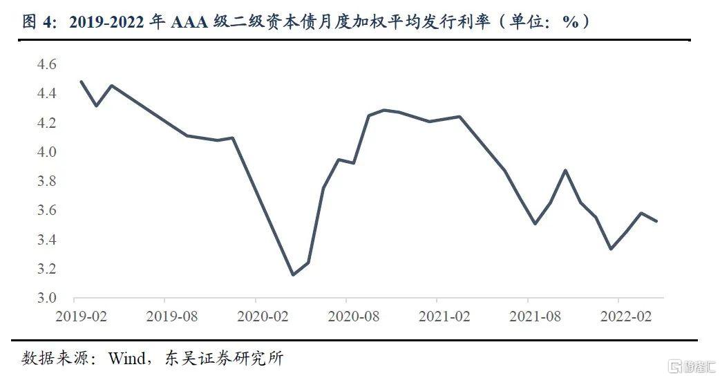 • 截至2022年4月30日,二級資本債加權平均發行利率從2019年1月的5.2%震盪下行至3.53%,下行幅度達167BP,加權平均發行利率整體呈波動下行趨勢。分評級來看,AAA級二級資本債加權平均發行利率下降幅度較AA+及AA級債券更大,2019年至2022年4月期間,已發行AAA、AA+、AA級發行利率分別下行96BP、86BP、60BP,表明高評級二級資本債的融資成本優勢的增速相對凸顯。