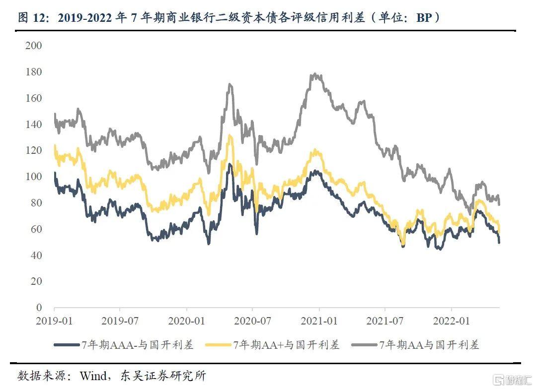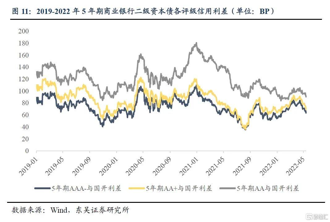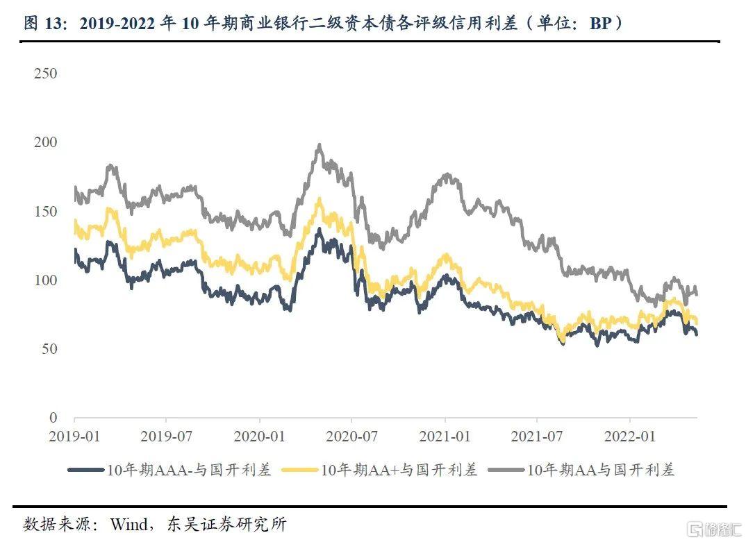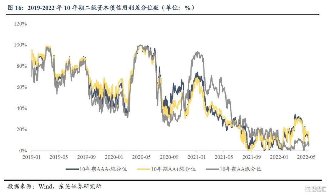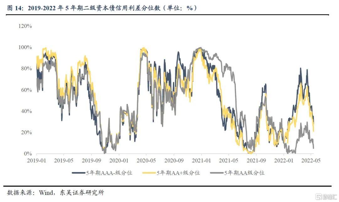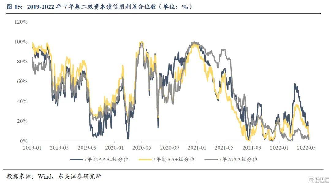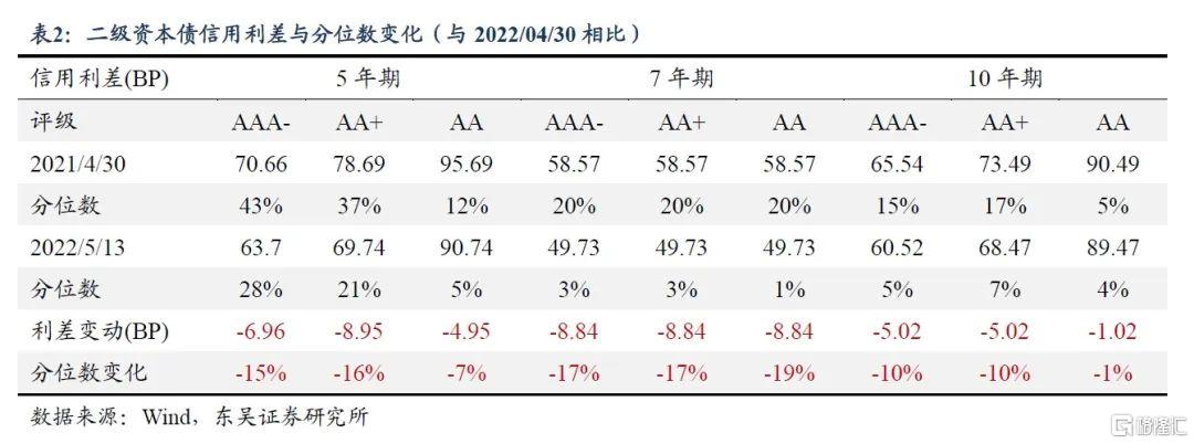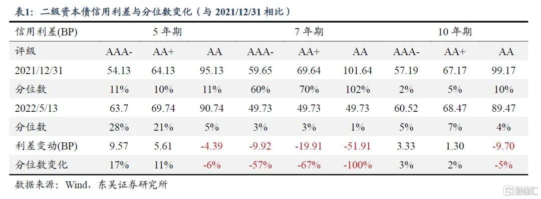 截至2022年5月13日,5年期二級資本債中,AA級二級資本債利差水平處於近三年利差極低位置,約5%,AAA-與AA+級利差水平則處於近三年中位,分別爲28%和21%;7年期和10年期二級資本債中,各等級利差水平均處於近三年極低位置,歷史分位數水平不超過10%。從變化情況來看,目前與2021年末相比,除5年期和10年期的高等級二級資本債品種以外,其餘品種利差水平均下降;與2022年4月末相比,所有期限和級別的二級資本債品種信用利差均呈現下降。