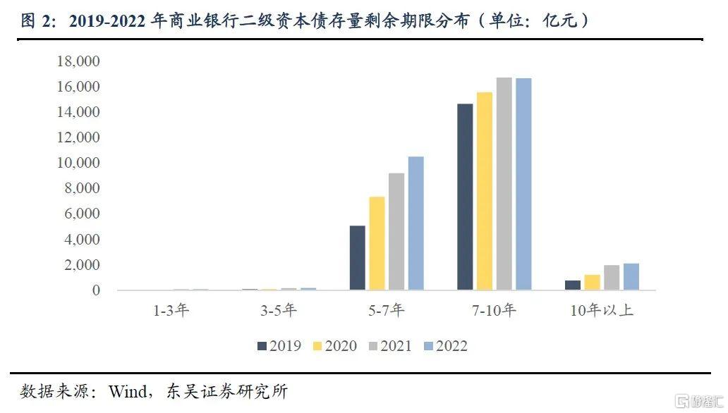 2019年以來,商業銀行二級資本債在我國債券市場發行活躍,存量債券餘額逐年上升。根據Wind概念板塊二級資本工具數據顯示,截至2022年4月30日,從總量角度以觀,二次資本債存量規模達29,475.10億元,2019年至2021年期間存量規模年均複合增長率達17%;從結構角度以觀,債項評級分佈方面,二級資本債在2019年至2022年4月各年度期間均以AAA高評級爲主,AA+及AA級次之,整體債券違約風險可控;剩餘期限分佈方面,二級資本債總體以7-10年期爲主,5-7年期次之,整體偏較長期限,或主要源於商業銀行發行二級資本債的目的在於補充二級資本,資金具有長期性及穩定性的要求,因此二級資本債發行基本爲10年期及15年期的長期限。根據巴塞爾協議Ⅲ,中國銀監會要求考慮儲備資本的最低核心一級資本充足率、一級資本充足率和資本充足率分別爲7.5%、8.5%和10.5%,因此商業銀行通過發行二級資本債,可提高資本充足率以滿足監管要求,拓寬資本補充渠道,有利於優化資本結構及增加抗風險能力。總體而言,近3年來商業銀行二級資本債存量增速較快,結構總體趨於穩定,期限與評級分佈比較集中。