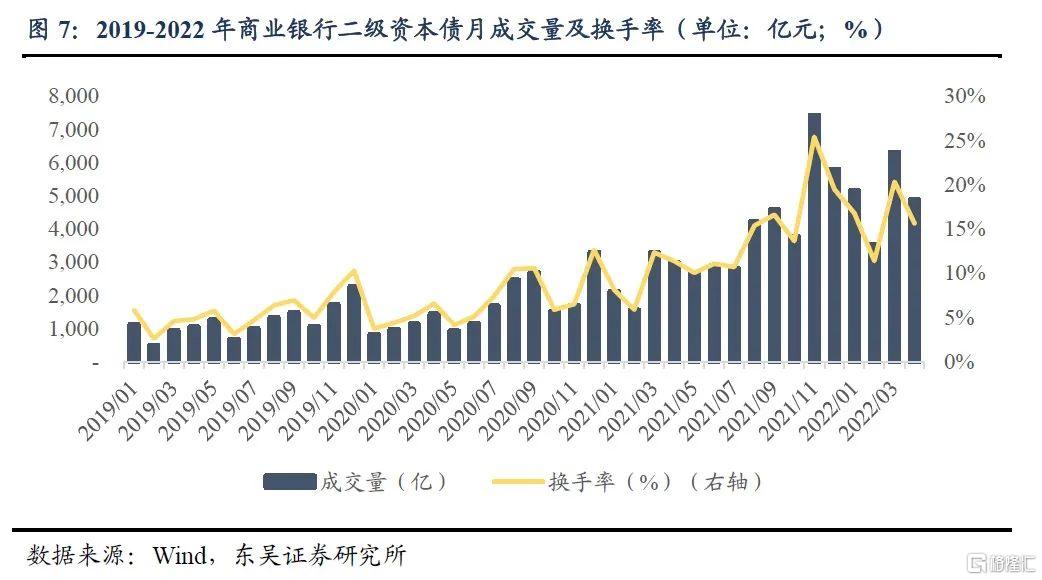 根據Wind概念板塊二級資本工具統計口徑,自2019年至2022年4月期間,商業銀行二級資本債二級市場月成交量呈現顯著增長,月換手率波動上行趨勢明顯,表明二級資本債的市場流動性與市場熱度逐年提升。2021年11月換手率達3年期間最高點25.4%,此後出現一定回落,但整體上行趨勢不改。截至2022年4月,當月換手率爲15.66%。近三年月成交量與換手率走勢基本吻合表明二級資本債存量增幅穩健,增速或不及成交量,側面佐證二級市場交易熱情及需求或較一級市場發行及供給更高,市場流動性較好提示二級資本債供需兩端存在一定失衡,需求大於供給的情形下意味着市場潛力仍存在進一步挖掘的空間。