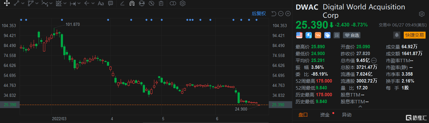 格隆匯6月27日丨特朗普社媒殼公司DWAC(DWAC.US)跌8.73%,報25.39美元。公司董事會所有董事都收到了美國證監會的傳票,要求他們提供與美國前總統唐納德·特朗普社交媒體公司有關的交易的更多數據。