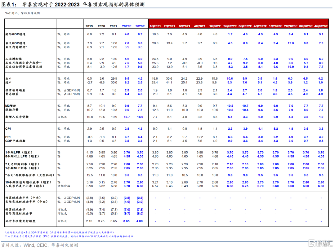 華泰宏觀對於2022-2023 年各項宏觀指標的具體預測,請參見圖表1。