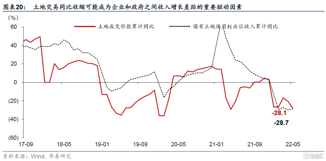 從收入增長方面,預計居民收入增長將與名義GDP變化大體同步,政府收入在2022下半年降勢趨緩,而企業收入增長回升將快於政府收入——其中土地交易同比收縮可能是兩者收入增長差距的重要驅動因素。今年1-5月,土地成交價款累計同比增長-28.1%,國有土地使用權出讓收入累計同比增長-28.7%,地方政府減收較爲迅猛(圖表20)。