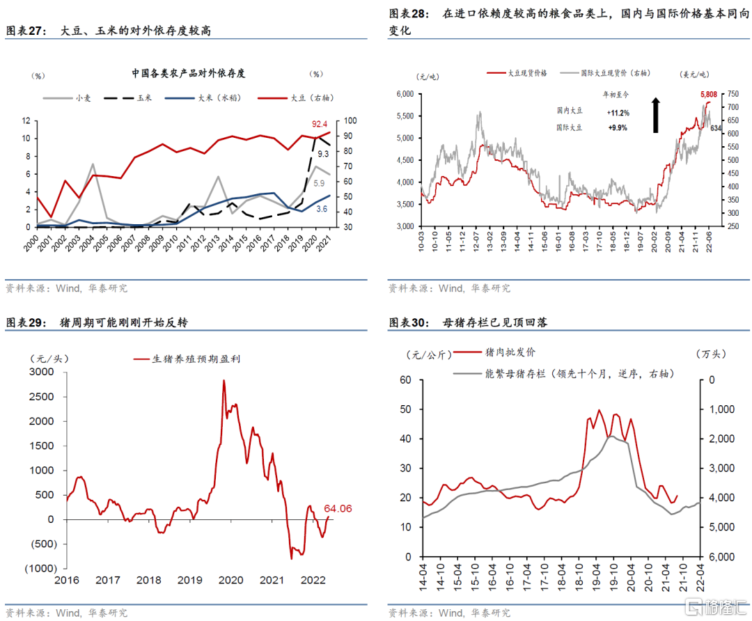 1)國內糧價有一定的上行壓力、價格“中樞”受到俄烏危機和國內疫情的影響明顯擡升。糧食在整體CPI中佔比約爲1.85%。俄烏衝突爆發後,玉米、大豆等全球糧食價格普遍上漲超過20%,同時美國農業部數據預測2022/23年度全球糧食產量將進一步下行、供不應求情況加劇。中國的糧食並不完全自給自足,OECD數據顯示21年中國對大豆的進口依賴度超過90%,玉米和小麥的進口依賴度則不到10%;在進口依賴度較高的糧食品類上,國內與國際價格基本同向變化(圖表27和28)。此外,OEC數據顯示2020年中國從烏克蘭進口玉米的佔比達整體進口量的29%,戰爭爆發後,玉米價格難免受到影響;疊加豬肉價格回升、飼料需求上升,玉米價格可能仍面臨進一步上漲壓力。另一方面,今年春節後吉林爆發本土疫情,較爲嚴格的防控措施持續至5月中旬,而Wind數據顯示2021年吉林省在全國玉米的產量佔比超過10%、豆類和稻穀產量佔比均超過3%。