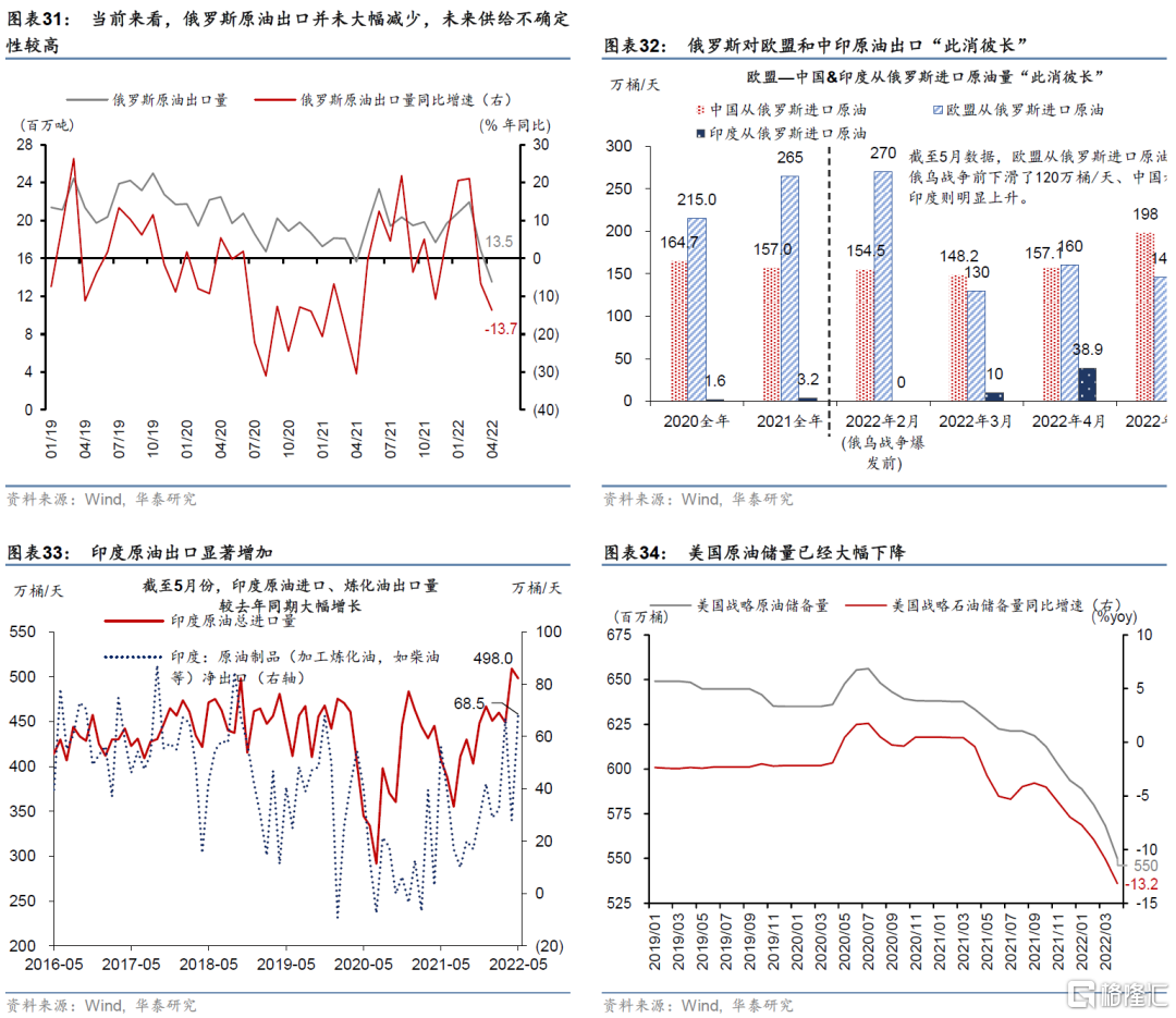 能源方面,全球供需平衡仍將偏緊、尤其是隨着秋季之後中國增長回升、亞洲國家對外重啓、且歐洲步入冬季取暖旺季——預計石油今年3季度均價回升至130美元左右、且2023年難顯著下行。今年以來全球能源價格通脹走勢較爲迅猛,我們預計今年3季度布倫特油價可能維持在130美元/桶的高位,2023年亦在120美元/桶附近(圖表35)——假設背後的邏輯如下:1)俄烏戰爭爆發後,對俄製裁以及隨之而來對全球石油供應的實際減量可能比俄羅斯對歐美的表觀出口下降要少——原因是俄羅斯石油“曲線出口”明顯增多,且制裁對俄羅斯石油出口的最高點仍未來臨(圖表31和圖表32);5月初,歐盟宣佈計劃在未來6個月內“有序地”減少俄羅斯石油進口。2)美國的原油戰略儲備從去年中以來持續快速下降,當前同比降幅已經超過13%,拋儲超過一億桶,進一步拋儲帶來的增量可能相對有限(圖表34)。3)在需求側,根據OPEC預測,2022年全球石油需求仍將從2021年的9700萬桶/天上升至接近1億桶/天,基本回到疫情前水平。4)此外,中國本土疫情緩解後,對原油的需求也將邊際回升,而中國是全球第一原油進口國和第二原油消費國。至秋冬旺季後,脆弱的原油供需平衡可能更爲顯著。
