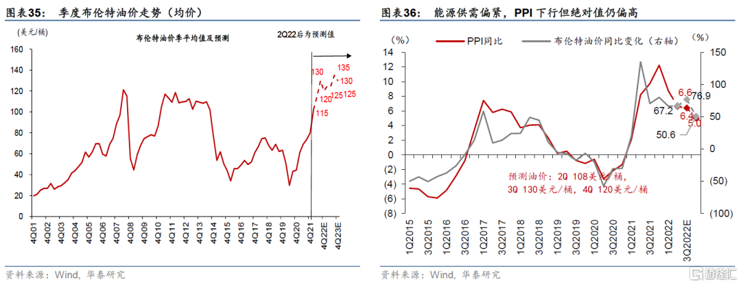 高基數下PPI有望下行,但絕對值仍然偏高——2022年底PPI預計降至5% 以下,但繼2021年達到8.1%的平均水平後,2022-2023年均PPI仍可能上升達6.7%、4.4%。如上文所述,我們預計今年3-4季度布倫特油價均價可能爲130、120美元/桶,而2023年4個季度分別爲125、125、135、130美元/桶(圖表35)。除油價維持高位外,國際動力煤價格(紐卡斯爾動力煤現貨)快速上漲至400美元/噸之上,相比今年3月漲幅超過30%;此外,天然氣價格亦快速上漲。另一方面,在內需走弱和保供穩價政策的雙重驅動下,國內原材料價格較此前有所回落。往前看,隨着穩基建、穩地產力度上升,工業品價格邊際可能有支撐、不會大幅下跌。考慮到去年下半年的超高基數,PPI同比可能回落至3季度的6.4%左右和4季度的5.0%左右(圖表36)。