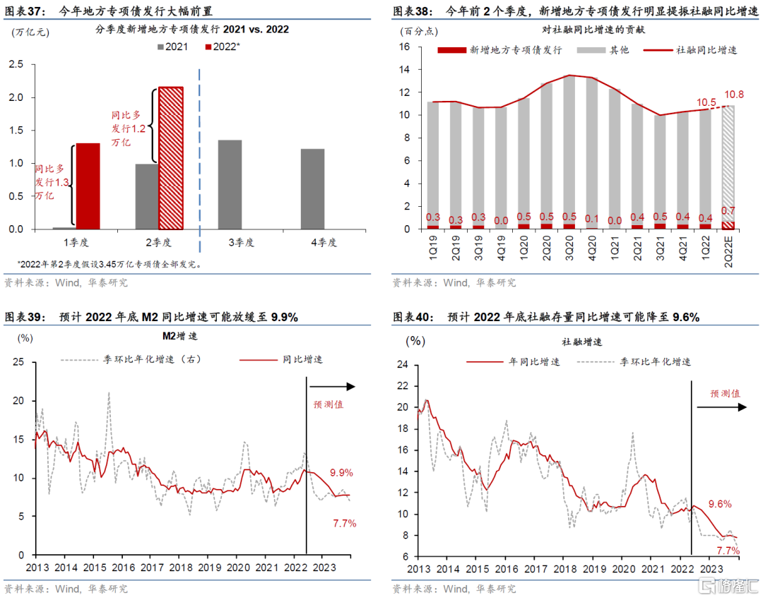 預計2022年底M2增長可能放緩至9.9%,社融存量同比增長可能降至9.6%。考慮到下半年貨幣擴張勢頭邊際減弱、疫情緩解後居民超額儲蓄下降、以及地產去槓桿週期的持續拖累,預計M2和社融增長高點可能出現在2022年5-7月。同時,今年地方專項債發行節奏大幅前置,按照用於項目投資的3.45萬億元專項債全部於6月底前發完的假設,今年1、2季度地方專項債同比分別多發行1.3、1.2萬億元,分別提振社融同比增速0.4、0.7個百分點(圖表37和38)。而地方專項債集中於上半年發行之後,下半年政府債融資可能同比大幅下降,從而給下半年社融增長帶來一定的不確定性。綜合來看,預計2022年底M2同比增速下行至9.9%,社融存量同比增速降至9.6%(圖表39和40)。