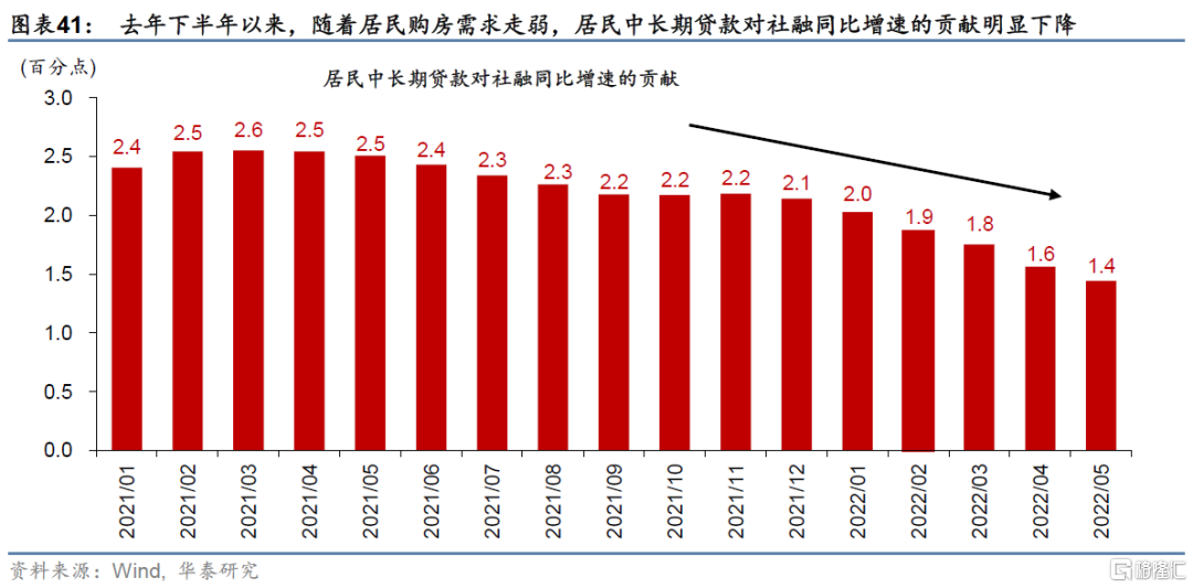 2023年,預計新增社融從今年的31萬億元左右下行至27萬億元左右,反映財政擴張力度有所下降。從長週期角度看,地產行業去槓桿週期仍在推進。經過20多年的相對高速發展,無論對於實體經濟還是金融體系而言,地產行業已成爲舉足輕重的行業。地產持續去槓桿對房企以及居民融資需求的拖累可能會在明年繼續顯現(圖表41)。隨着2022年經濟增長下行壓力加大,地方融資平臺可能在拉動基建投資、甚至穩房地產投資中都發揮較大作用。2023年地方融資平臺可能會重新面臨去槓桿壓力,其融資需求或將再度放緩。此外,由於今年財政寬鬆可能在一定程度上提前支取明年的財政赤字,2023年財政擴張力度或將下降。由此,預計2023年新增社融可能從2022年的約31萬億元下降至27萬億元左右,M2和社融存量同比增速也將放緩至7.7%左右。