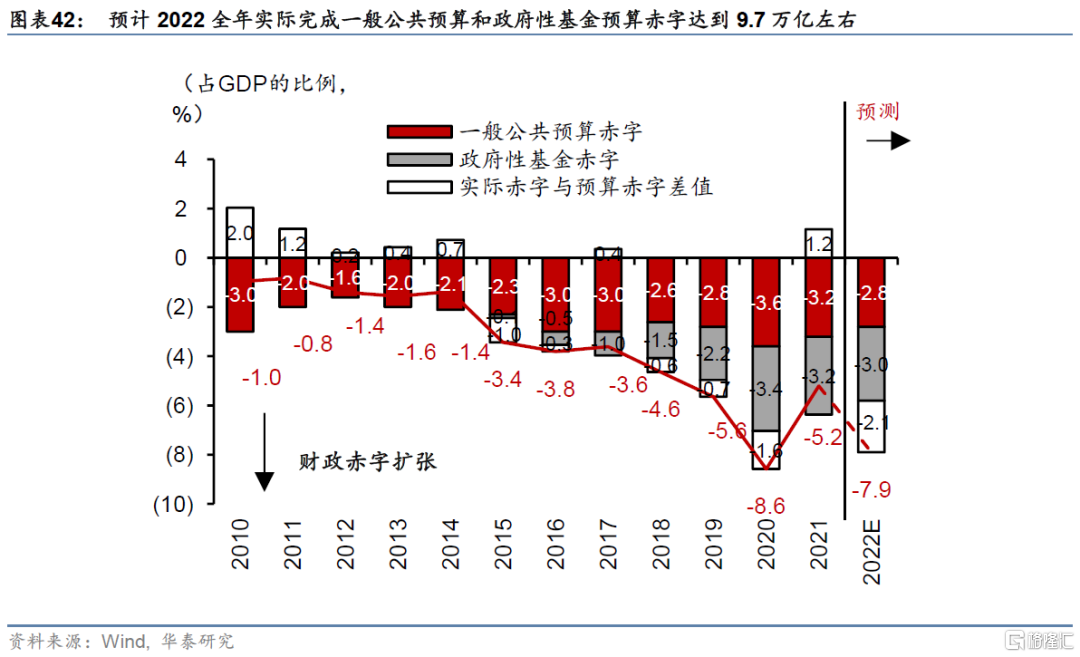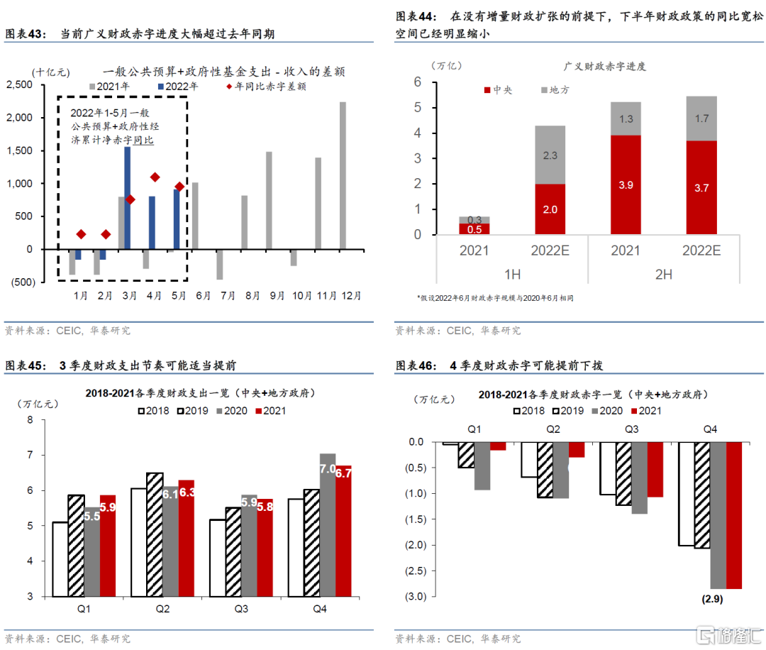 財政政策方面,預計2022全年實際完成一般公共預算和政府性基金預算赤字達到9.7萬億左右(約佔2022年GDP的8%),同比上升約3-4萬億;但考慮到上半年同比擴張幅度可能已達到3.5-4萬億元,下半年財政政策同比寬鬆空間較上半年明顯縮小。廣義的政府淨融資來源則主要涵蓋一般公共預算赤字(國債+普通地方債)、政府性基金赤字(地方專項債),以及調入資金及使用結轉結餘。根據兩會期間公佈的2022年財政預算草案,我們簡單匡算廣義政府淨融資可能爲9.7萬億元左右、佔2022年GDP比例約8%:2022年一般公共預算收入/支出分別爲21萬億元/26.7萬億元,而政府性基金預算收入/支出分別爲9.86萬億元/13.9萬億元,總體收支差額即爲9.7萬億元左右——而2021年實際實現的廣義財政赤字爲5.9萬億(圖表42)。今年2季度財政擴張加速,增值稅留抵退稅快速實施、累計超過1.6萬億元,企業上繳稅收週期性減少,賣地收入大幅下滑,1-5月累計廣義財政赤字已達到2.97萬億元,相比去年1-5月的盈餘3,000億同比增加3.3萬億元左右。由此,在沒有增量財政擴張的前提下,下半年財政政策的同比寬鬆空間已經明顯收窄(圖表43和44)