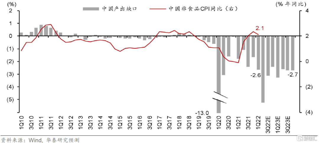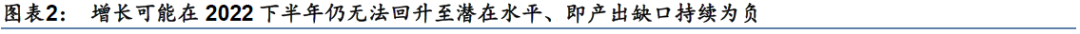 根據目前有的信息和假設進行估算,我們預計2022年3季度實際GDP環比折年增長可能從2季度的-9.2%反彈至+12.8%、成爲2022-23年季度環比增長的“高點”,並將3季度同比增長推升至4.9%。增長層面,投資者短期關注點之一無疑是3季度增長反彈的力度。根據現有數據估算,2022年2季度實際GDP環比折年增長可能在-9-10%之間,隱含的同比增速在1-1.5%之間。這套環比預測隱含的假設是,2022年2季度和3季度相抵、隱含的產出水平仍未回到疫情前潛在增長路徑(即部分地區經濟活動仍將受到到疫情擾動)——這和2020年第一波疫情防控放鬆後的走勢相似(圖表2,增長可能在2022下半年仍無法回升至潛在水平、即產出缺口爲負)。