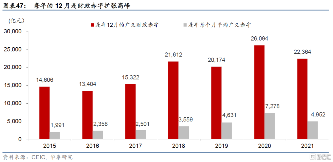 因此,我們不排除 2022年3季度財政“借調”一部分2022年四季度和2023年的預算赤字的可能性,但這也意味着2023年財政寬鬆空間可能縮小。由於涉及預算審批、會計制度、項目結算以及預算編制等諸多問題,4季度/年底往往是財政支出加速的時期——過去四年內,4季度單季赤字最高可達近3萬億元,佔全年財政赤字的50%以上(圖表45和46);其中12月更是財政資金集中加速投放的時點(圖表47)。今年疫情爆發後,財政被動減收、抗疫支出又有所增加,短期內政府可能主要通過提前支取 4季度的預算支出和赤字的形式來補充3季度的收支“缺口”,且不排除再向前“借調”一部分2023年赤字的可能性。表觀看,2023年一般公共預算和政府性基金預算赤字率可能與2022年預算赤字(2.8%+3%)大體持平,其中地方專項債額度可能4萬億左右,但實際實現赤字率可能在2023年明顯縮減至6%左右。