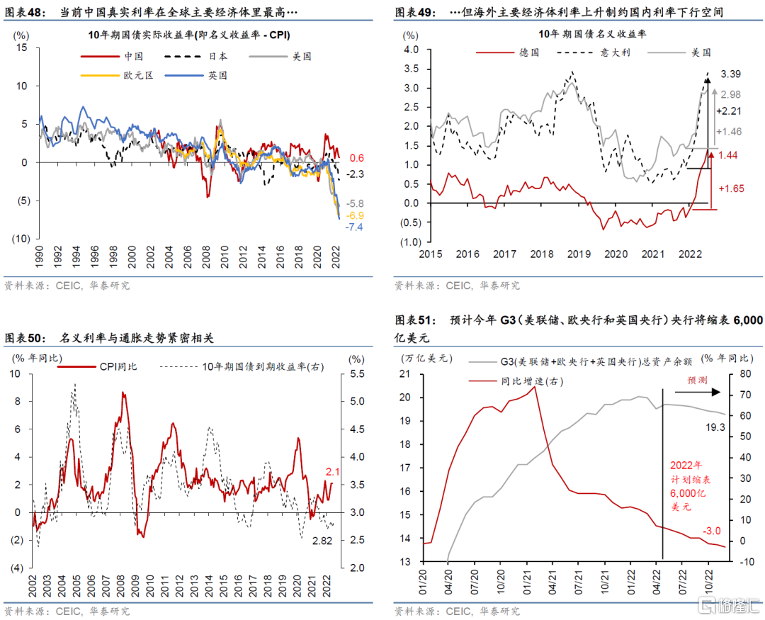 外圍環境層面,海外主要經濟體利率近期“易漲難跌”,中美利差倒掛可能進一步走闊的背景下,國內利率下行空間明顯受限。歐洲財政擴張及日本通脹壓力升溫下,歐債、日債利率均可能面臨明顯較大的上行壓力,或將限制美債利率的下行空間。具體看,烏克蘭戰後重建、俄烏衝突加大歐洲國防開支以及加快歐洲能源替代都將明顯推升歐洲財政赤字以及歐債供給。另一方面,由於以抗通脹爲單一目標,通脹攀升下歐央行將於7月起結束資產購買計劃,並大概率於今年7月開始加息。實際上,今年以來,海外主要央行先後退出寬鬆政策,預計G3央行全年縮表6,000億美元(圖表51)。