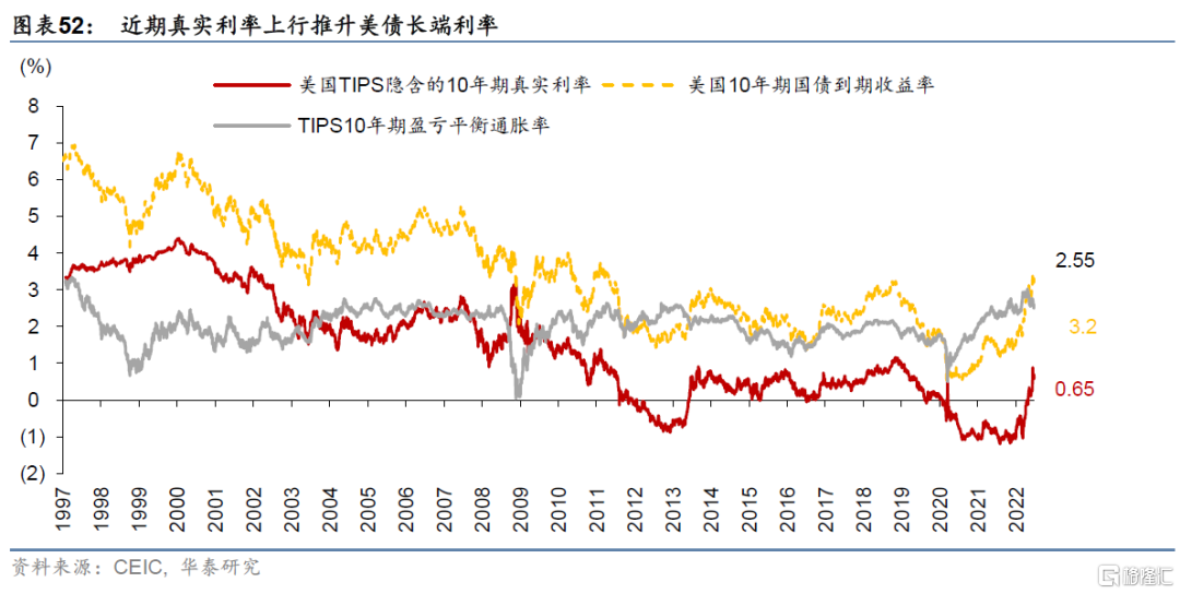 同時,隨着日元大幅貶值、以及日本國內通脹超過2%的既定目標,日本央行可能最終將被迫放棄“曲線控制”,日債利率面臨較大的上行風險。由此,雖然美國10年期通脹預期可能不再上行,但10年期真實利率(即名義利率-通脹預期)仍在快速上行,從而帶動日本10年期國債收益率上行(圖表52)。