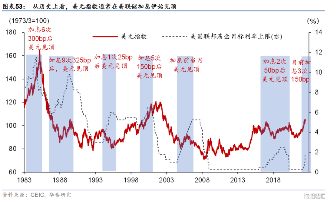 2.但2022年4季度及以後,當全球(包括日本央行)央行貨幣政策取向更爲明確後,美元可能震盪築頂,而人民幣兌美元匯率總體趨於穩定、但不排除兌歐元和其他歐亞國家匯率小幅貶值。正如我們在《人民幣貶值向全球傳遞了什麼信號?》(2022/5/19)中所闡述的, 4月中旬-6月中旬人民幣快速貶值,向全球傳遞中國需求快速走弱的信號。由此,中美經濟週期和政策預期的走勢,可能開始從分化走向“融合”。值得說明的是,這裏的“融合”不是指週期的絕對位置,而是相對預期而言,可能短期美聯儲超預期鷹派的動力在下降,因此我們重申美元指數或將見頂回落的判斷。回顧美聯儲歷次加息週期,美元指數上漲最快的時候通常是加息預期快速升溫的時候,而在加息落地後,隨着美國增長預期的下調和其他央行加息頻率地上升,美元指數通常會見頂回落(圖表53)。