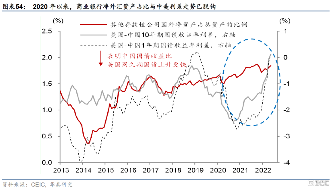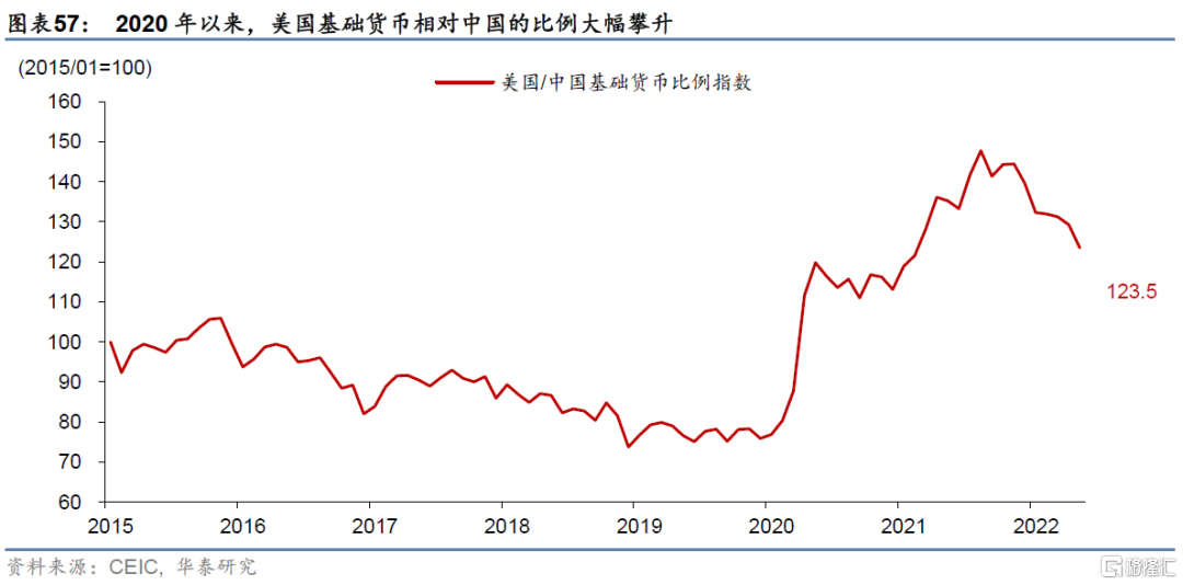 3.中長期看,支持人民幣名義匯率升值的判斷。首先,我們重申人民幣匯率與中美利差無關,一個突出的例證是,2020年以來,作爲重要外匯持有方之一的商業銀行國外淨資產佔比與中美利差走勢已經持續背道而馳(圖表54)。其次,從和基本面相關性更高的真實匯率角度,2021年來人民幣實際匯率已經通過中國相對較低的通脹(包括商品和資產價格通脹)而完成較大幅度的向下調整,名義匯率可能不再有貶值的需要(圖表55和56)。中長期,從金融資產相對邊際投資回報率角度,人民幣也“成色”更足。中國基礎貨幣擴張速度明顯不及歐美,金融資產派生速度也明顯低於歐美,因此長期邊際投資回報率損失較少(圖表57)。另一方面,我們維持一直以來的“弱美元週期”判斷、即金融資產邊際投資回報率長期下降拖累美元匯率。