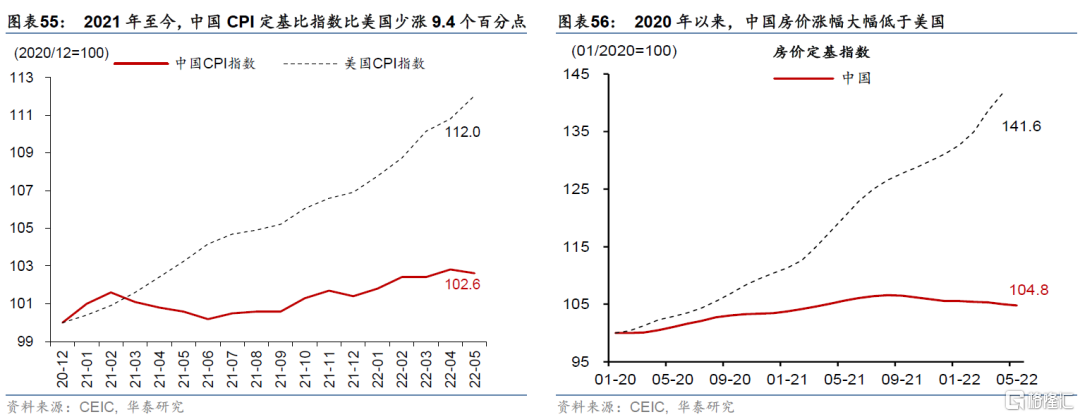 由於產出缺口持續爲負,核心通脹可能呈總體較爲低迷的走勢。預計2022年全年非食品CPI在2.3%左右,2-4季度分別爲2.2%、2.5%和2.4%——去除能源價格的核心通脹則更爲低迷。CPI非食品各分項中,石油價格高企可能繼續推升交通類價格,尤其是疫情緩和後旅遊、機票、酒店住宿等價格短期內可能會出現“補償性”上漲,推升3季度非食品通脹環比走勢(根據攜程數據,6月29日工信部宣佈取消行程卡“星號“之後,機票搜索量快速上升,預訂量相比前一日增長近3成)。不過總體來看,短期的“脈衝式”上升之外,非食品CPI大概率仍將保持溫和,主要是由於部分地區經濟活動仍零星受疫情擾動,且地產產業鏈承受長週期去槓桿壓力的拖累,經濟增長可能不會回到疫情前潛在增長路徑(前文圖表2);同時剔除掉能源價格後,核心通脹可能更爲低迷。具體來看,CPI非食品中的衣着、文娛用品、生活用品及醫療等價格有望保持溫和,而總體資產價格通脹可能亦難言強勁。