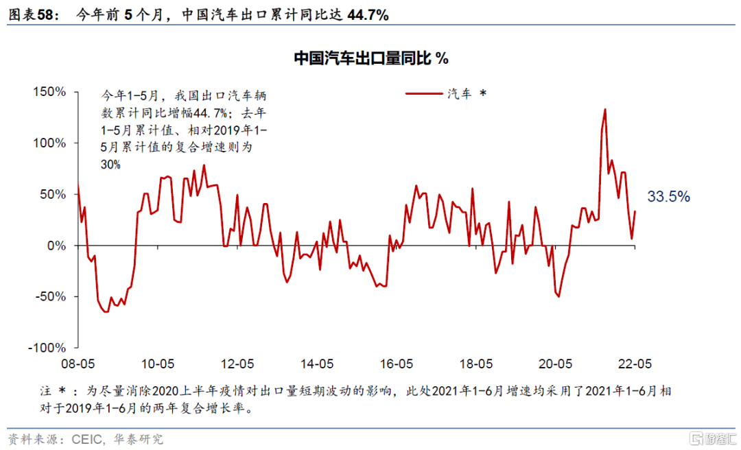 2)中長期,值得注意的是,中國製造業的原材料和勞工成本優勢經歷全球疫情和俄烏衝突的衝擊後,相對更強、而非更弱、尤其在汽車和新能源領域。隨着供應鏈擾動逐漸消退,這一相對優勢有望凸顯。雖然以上海疫情爲代表的第6波疫情對出口產生明顯擾動,而上海是全國汽車產業首要“重鎮”,然而令人驚歎的是,今年1-5月中國汽車出口仍然同比增長44.7% (圖表58)。如圖表59所示,國內通脹壓力大體可控、美元計的工業品出廠價格指數(PPI)相對歐美均少上升24個百分點左右,而2季度疫情衝擊過後,中國能源價格及勞工成本的相對優勢有望進一步凸顯(圖表60),帶動部分製造業子板塊繼續拓展全球市場份額(如上所述的汽車、新能源、化工、工業原材料等)。即使在國內政策力度低於預期,全球貨幣緊縮影響高於預期的較悲觀情形下,也蘊含結構性機遇——如在全球食品能源高通脹環境下盈利能力增強、中國相對比優勢進一步上升、或產能擴張空間結構性上升的板塊可能受總體宏觀環境的影響較小,如農業、新能源、新能源車、傳統能源升級、化工新材料、產業升級(如高科技製造業等)、國防等領域。