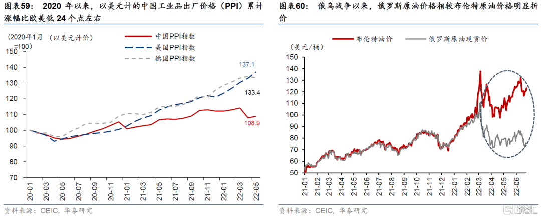 雖然中國的通脹水平在全球主要經濟體中屬於較低水平,甚至有望低於長期通縮的日本,但是隨着中國的食品/能源等多項“可貿易品”價格成爲全球“窪地”(圖表21-24),且全球食品、能源、房租、勞工、甚至部分耐用品價格的通脹短期仍然難以逆轉,中國國內通脹水平也有望達到、甚至超過年初3% 的目標(CPI)。同時,隨着全球地緣政治局勢的變化和疫情後重啓需求的進一步拉動(包括中國需求恢復的因素在內),全球能源、原材料、農產品、甚至部分耐用品的供需矛盾缺口仍然無法完全彌合,需要價格指標(通脹)上升進一步引導供需平衡。
